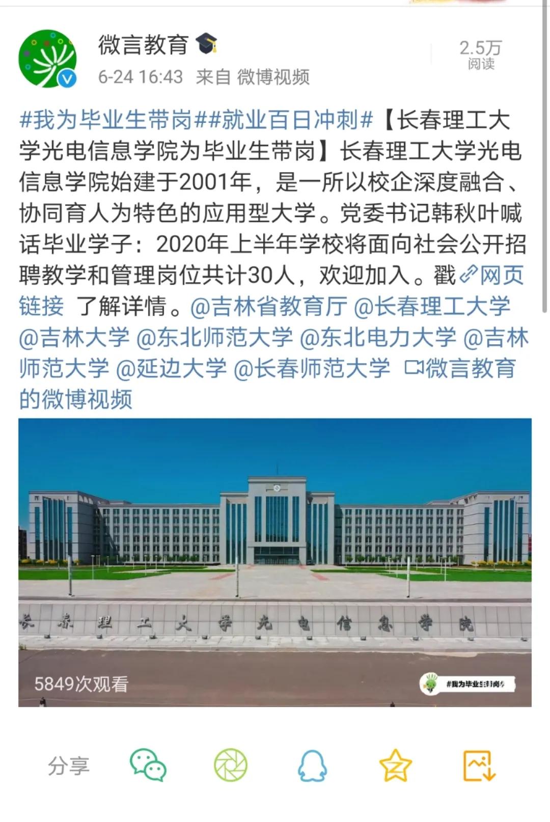 教育部官方微博微言教育发布:长春理工大学光电信息学院#为毕业生带岗#